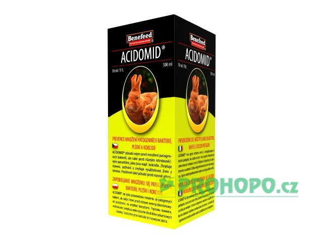 ACIDOMID® je špičkový výrobek moderní koncepce působící nejen proti množení patogenních bakterií, ale velice dobře také tlumí rozvoj a množení nitrobuněčných parazitů jako např. kokcidií. Není však léčivo, neobsahuje ani kokcidiostatika a nezanechává tak rezidua v organismu.