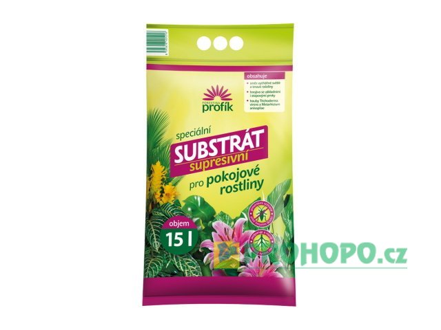 Supresivní substrát pro pokojové rostliny patří do řady profesionálních substrátů PROFÍK a je určen speciálně pro sázení a přesazování všech druhů pokojových rostlin a palem. Je připraven ze směsi vytříděné světlé a tmavé rašeliny s upravenou reakcí o hodnotě pH 5 – 6,5. Substrát je obohacen hnojivem se základními i stopovými živinami v nezbytném rozsahu, což má příznivý vliv na růst a vývoj rostlin. Supresivní substrát obsahuje 2 druhy hub potlačující původce významných houbových onemocnění (Trichoderma virens) a preventivně působící proti hmyzím škůdcům (Metarhizium anisopliae).