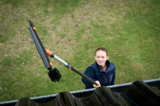 Kombinace kartáče a škrabky zajišťuje perfektní vyčištění okapů.