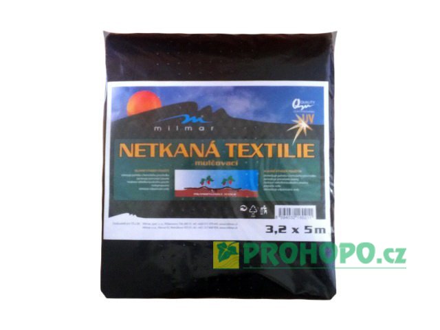 Černá netkaná textilie je určená k mulčování, jenž je pokrytí okolí rostliny materiálem. Textilie rozložená na půdu zabraňuje prorůstání plevele, půda se v jarním období dříve prohřívá a textilie dokáže naakumulovanou teplotu v půdě zadržet na delší dobu, což umožňuje rannější výsev. Díky otevřené struktuře textilie propouští vzduch i vodu a výrazně omezuje nežádoucí výpar z půdy, a to znamená výraznou úsporu vody při zalévání a příznivý vliv na rozvoj kořenového systému. Textilie je vyrobená technologií SPUN-BOND, podle které se dnes připravuje asi 46 % vlákenných vrstev pro netkané textilie. Výroba spočívá v tavení granulátu, zvlákňování přes trysky a rozkládání hotových filamentů následně vytvářející plošnou netkanou textilii. Odpadá tak pro ostatní textilní útvary charakteristická prvotní výroba vláken a jejich konverze na plošný útvar až v dalším kroku. Jako základní vlákno se nejčastěji používá 100 % polypropylen, jenž je odolný proti slunečnímu záření, napadení plísněmi, různými mikroorganismy, houbami či hmyzem. Vyznačuje se malou roztažností, hladkým povrchem a vysokou odolností proti otěru.