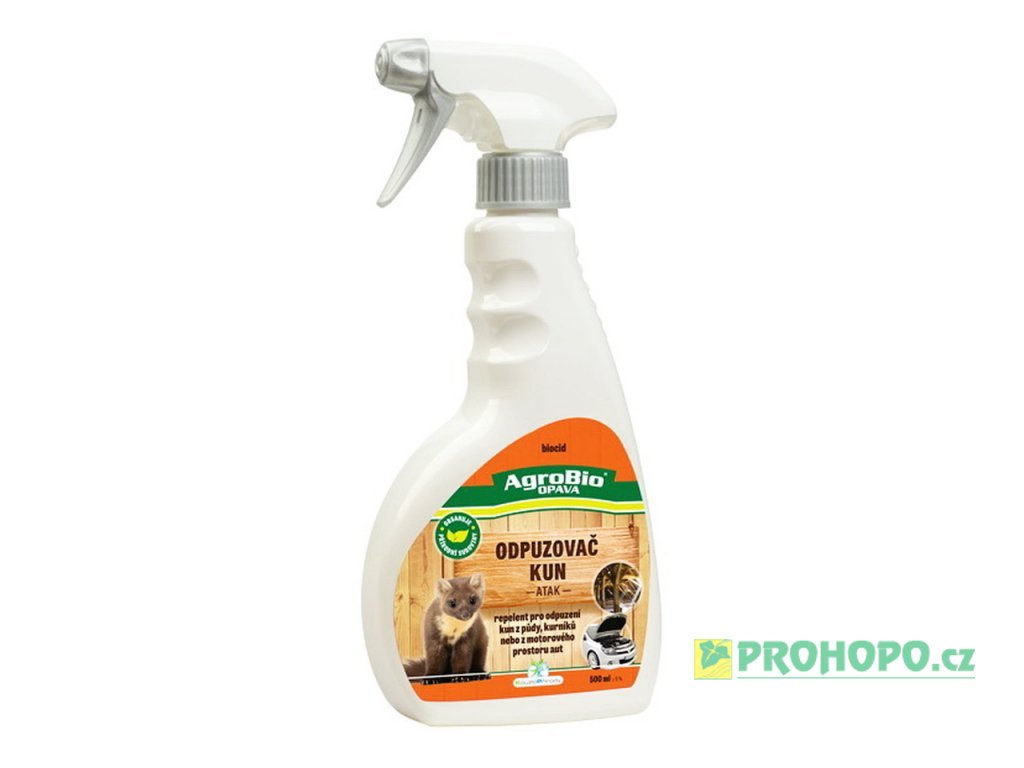 ATAK Odpuzovač kun spray je přírodní relepent určený k přímému použití v mechanickém rozprašovači. Aplikuje se opakovanými stisky kohoutku rozprašovače lehkým postřikem (nesmí stékat) na specifická místa, která chceme uchránit před nežádoucím výskytem kun. Po aplikaci se vytváří ochranný film, který zamezuje nechtěnému přístupu kunám a jejich škodám, které způsobují.