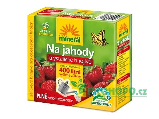 Krystalické hnojivo Mineral s lignohumátem na jahody je určené k výživě všech druhů drobného ovoce v průběhu jejich vegetačního cyklu. Vyváženým složením hlavních živin a obsahem mikroprvků poskytuje těmto rostlinám vše potřebné ke zdravému vývoji. Vysoký obsah fosforu a draslíku významně ovlivňuje množství květů a kvalitu plodů. Hnojení provádíme zpravidla klasickou zálivkou nebo postřikem na list. Pro zálivku nasypeme 20 g hnojiva (1 odměrka) do 20 l vody, zamícháme a zaléváme na substrát až do jeho nasycení. Hnojivou zálivku aplikujeme v období vegetace 1x za týden. Při postřiku na list smícháme stejnou dávku hnojiva tj. 1 odměrku v 20 l vody a tímto roztokem stříkáme listy rostlin rovněž 1x za týden. Postřik neprovádíme za přímého slunečního svitu, aby nedošlo k popálení listů slunečními paprsky.