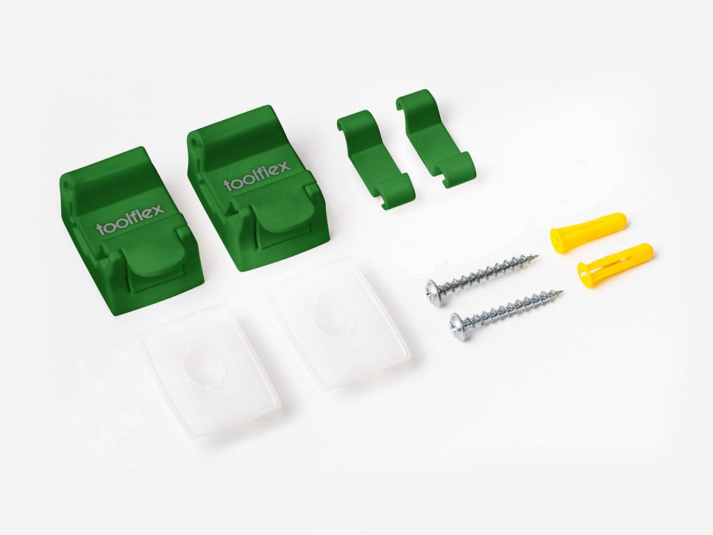 Toolflex One System – souprava obsahující 1 lištu o délce 54cm, 3 kusy držáku TF2–6 = zelených [15–35mm], 2 kusy klipu (držáku) lišty, 2 kusy silikonových podložek pod klip, 2 vruty, 2 hmoždinky