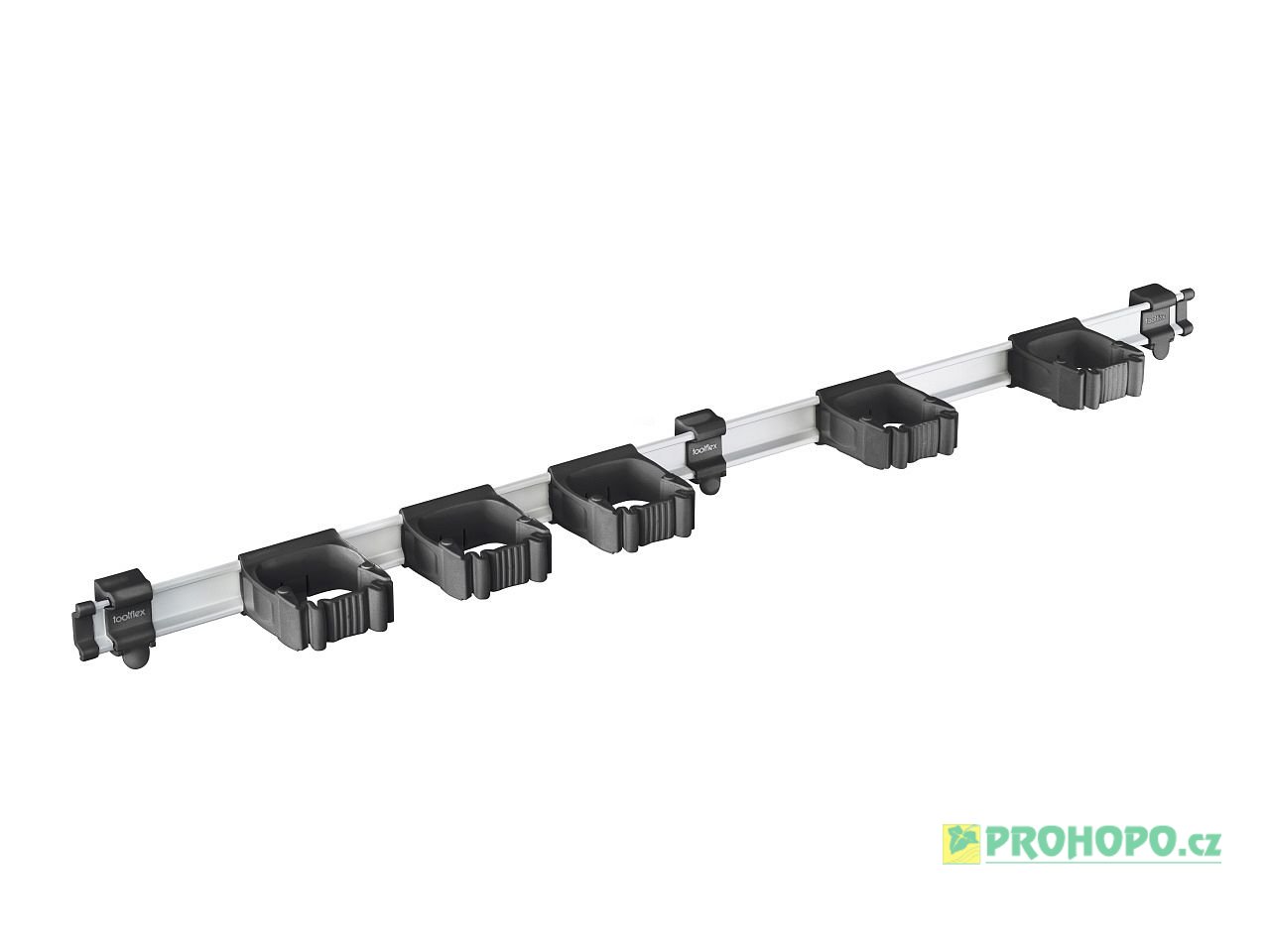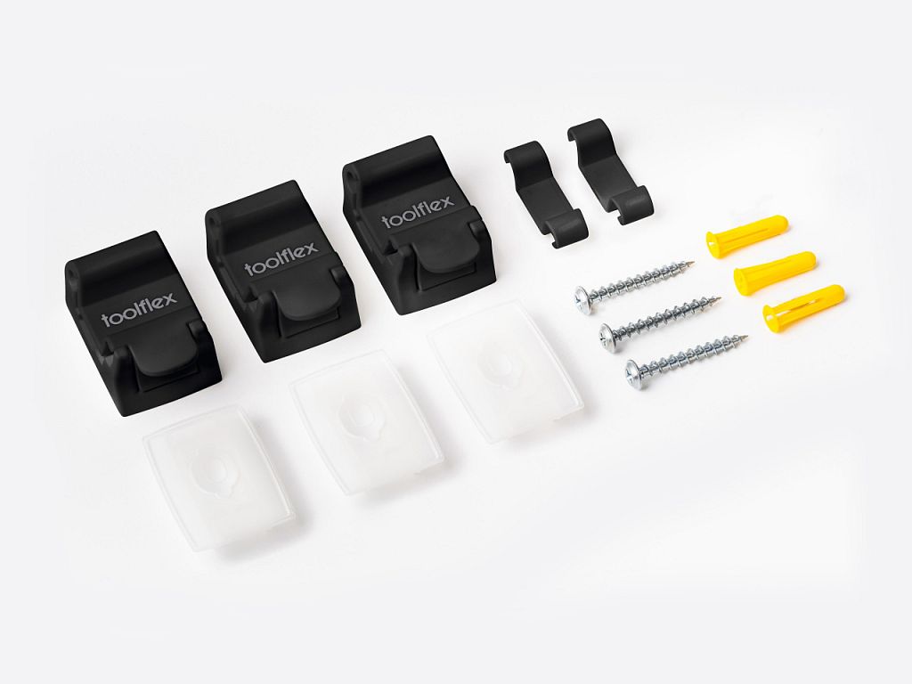 Toolflex One System – souprava obsahující 1 lištu o délce 94cm, 5 kusů držáku TF2–1 = černých [15–35mm], 3 kusy klipu (držáku) lišty, 3 kusy silikonových podložek pod klip, 3 vruty, 3 hmoždinky
