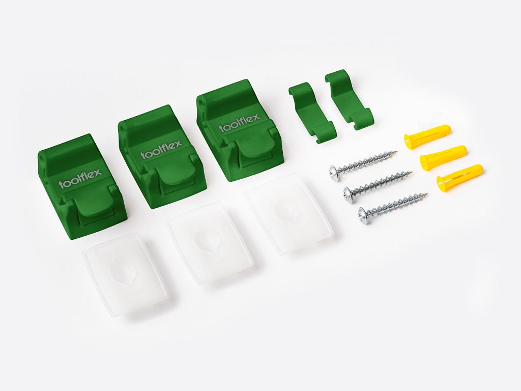 Toolflex One System – souprava obsahující 1 lištu o délce 94cm, 5 kusů držáku TF2–6 = zelených [15–35mm], 3 kusy klipu (držáku) lišty, 3 kusy silikonových podložek pod klip, 3 vruty, 3 hmoždinky