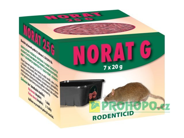 NORAT 25 G je granulovaná růžově zbarvená požerová nástraha k hubení škodlivých hlodavců jako je potkan, myš domácí v uzavřených objektech nebo jejich těsné blízkosti např. chaty, kůlny, bytové jednotky, sklepy, půdy apod.). NORAT 25 G je vyrobený ze směsi cereálií, cukru, tuku s přidáním dochucovadel, která zvyšují její konzumaci (palatabilitu). Nástraha představuje velice dobře vyváženou, nicméně však pro hlodavce vysoce toxickou potravu, která je zvláště výhodná pro použití v místech, kde se škodliví hlodavci živí granulovanými krmivy, domácími potravinami aj. Obsahuje hořké činidlo, které působí jako chuťový odpuzovač pro člověka.